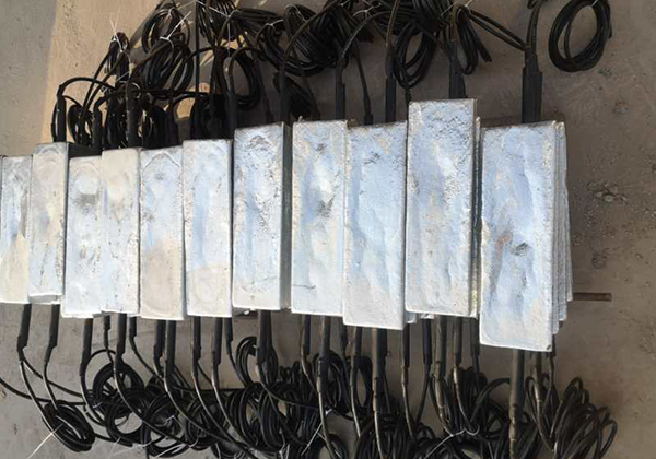 根據(jù)電化學(xué)原理,從鎂合金陽極材料體上通過土壤、水等電解質(zhì)向被保護(hù)體如鋼質(zhì)結(jié)構(gòu)提供陰極電流,使被保護(hù)的鋼質(zhì)結(jié)構(gòu)進(jìn)行陰極化,實現(xiàn)陰極保護(hù)。隨著電流的不斷流動,陽極材料不斷消耗掉。這就是犧牲陽極名稱的由來?!〕商祖V犧牲陽極,由鎂犧牲陽極錠1支,一根VV-10㎜2電纜3米,填包料50kg,棉布口袋1條,塑料編織袋1條組成。即棉布口袋內(nèi)有鎂犧牲陽極錠1支其鐵芯上焊VV-10㎜2電纜3米1根,焊接處做絕緣處理,并套有熱縮管。鎂犧牲陽極錠周圍均勻分布50kg填包料。棉布口袋外套塑料編織袋1條。
